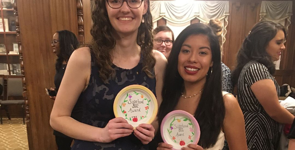 If you've been following us for the past 2 yeas, you probably know that every year we hold a spirit week the week leading up to Third Degree. This year our sisterhood committee planned an incredibly fun Spirit Week that involved a series of challenges each day. The more activities sisters participated in, the more points they earned. Although at the end of the week, Ex-MECs/fellow active sisters Addie and Halaina won the Sisterhood Spirit Award (pictured below), I think I speak for all sisters when I say that I feel like we all won and took something away from the Lambda Spirit Week - that is, how fun, amazing and easy it is to bond with our sisters not only in band and at TBS events, but also outside of class throughout the day!